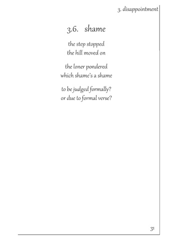 3. disappointment 3.6. shame the step stopped the hill moved on the loner pondered which shame’s a shame to be judged formally? or due to formal verse? 31
